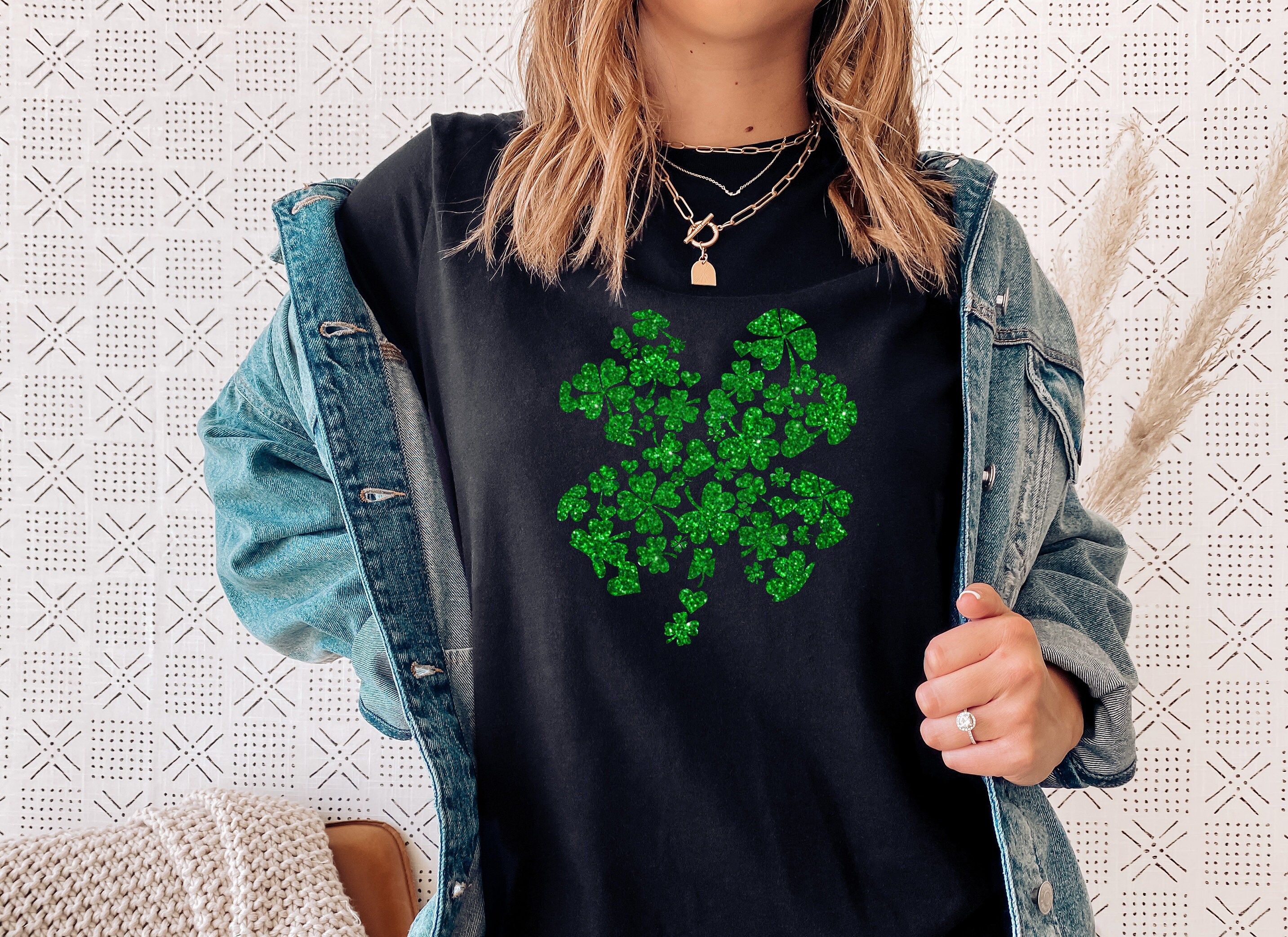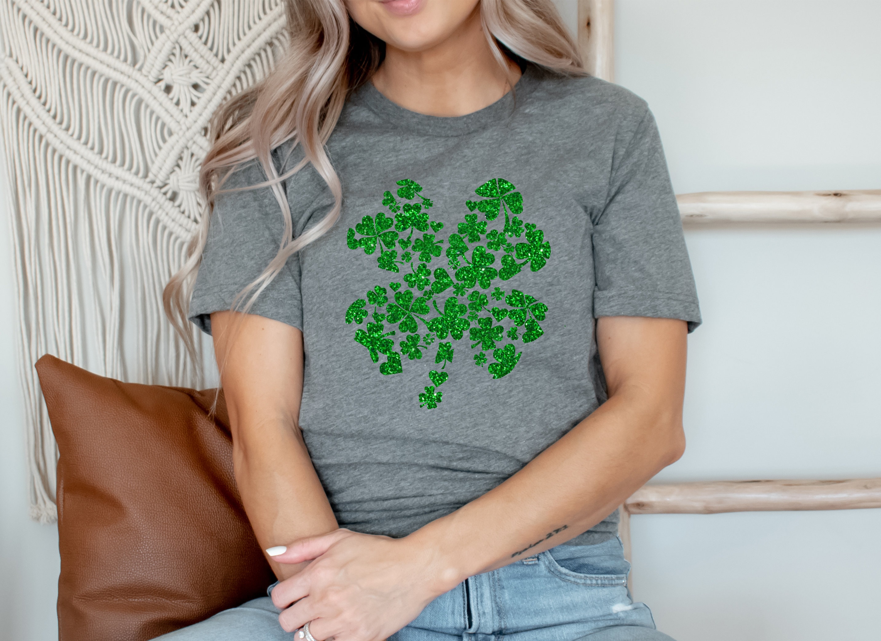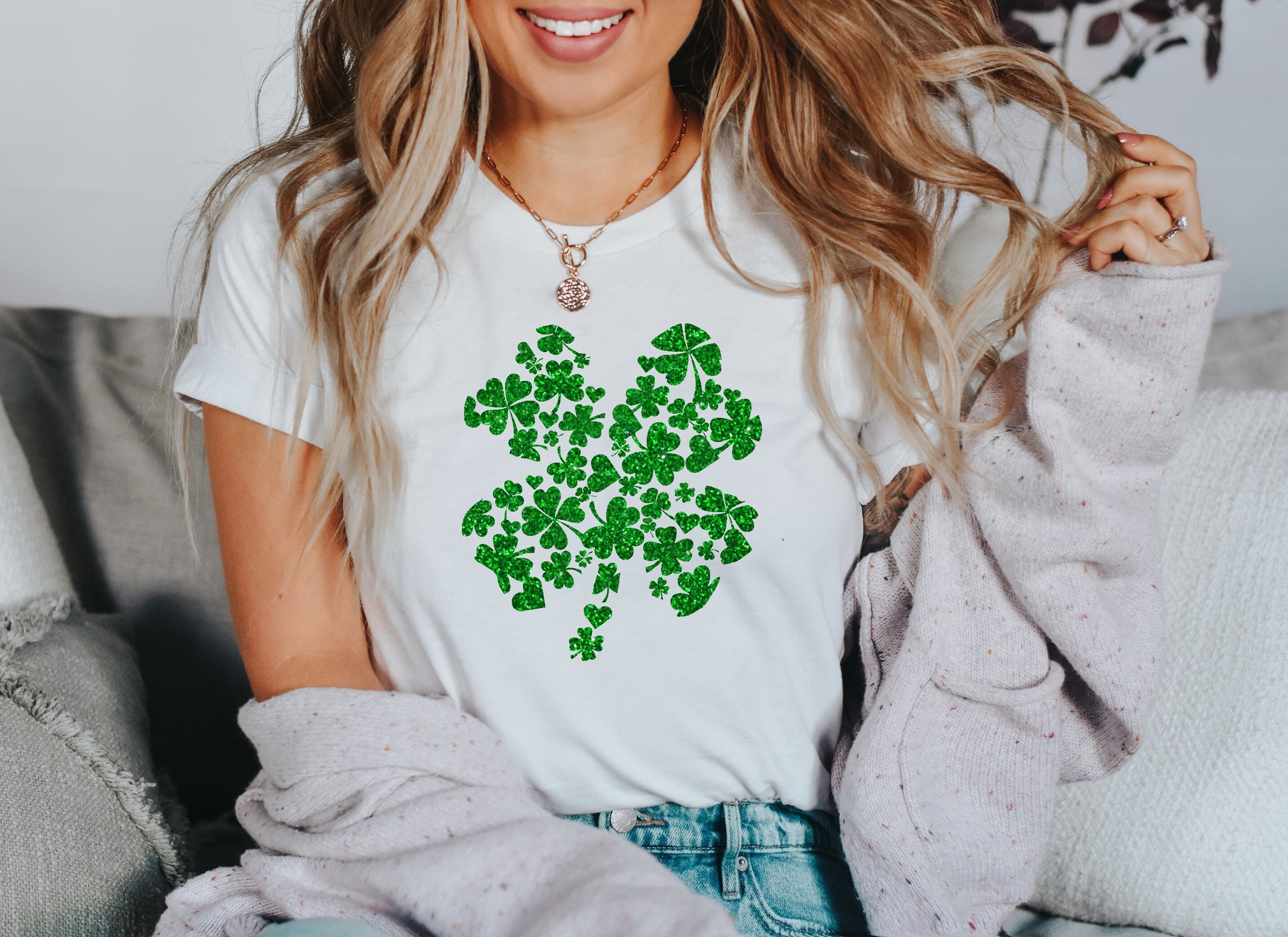 This St. Patrick's Day shirt is perfect for celebrating the luck of the Irish! Made of a lightweight, soft cotton blend, this stylish shirt features a festive four leaf clover made with little clovers, stunning glitter and a classic crew neck style. Whether you're attending a parade or just want to show your festive spirit, this St. Patrick's Day shirt is sure to make you stand out from the crowd! So make this St. Patrick's Day one to remember and add a bit of Irish luck to your wardrobe with this stylish clover-patterned shirt!
