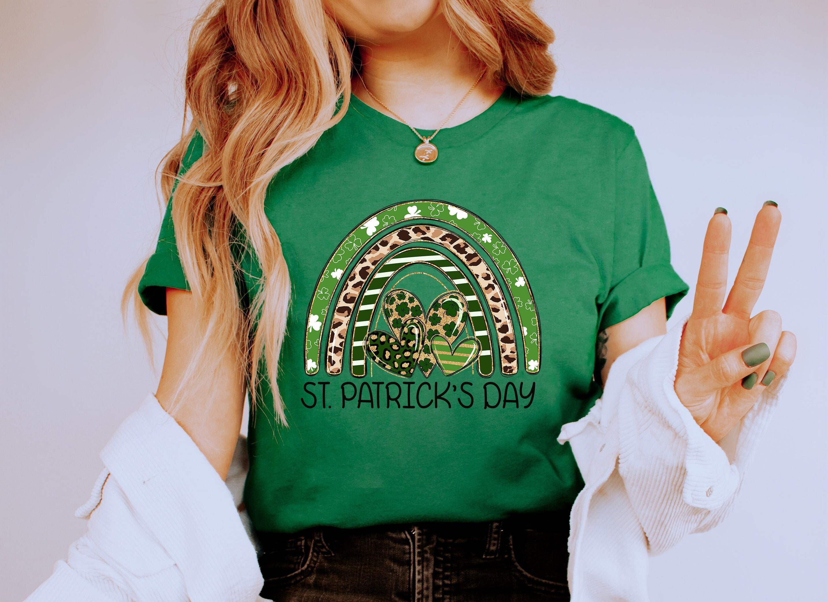 This St. Patrick's Day shirt is perfect for celebrating the luck of the Irish! Made of a lightweight, soft cotton blend, this stylish green shirt features festive hearts in the center of a gorgeous rainbow and a classic crew neck style. Whether you're attending a parade or just want to show your festive spirit, this St. Patrick's Day shirt is sure to make you stand out from the crowd! So make this St. Patrick's Day one to remember and add a bit of Irish luck to your wardrobe with this stylish clover-patterned shirt!