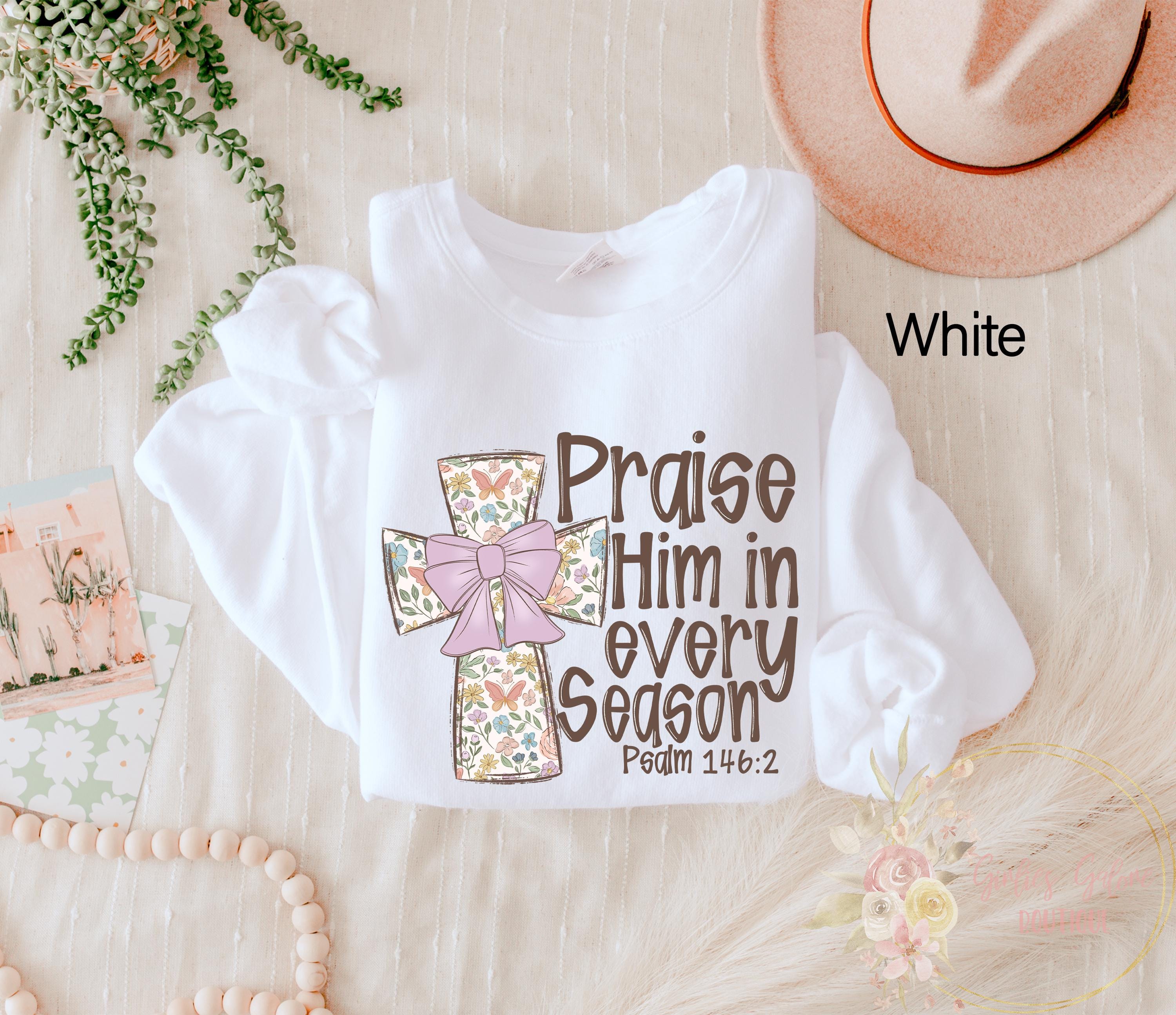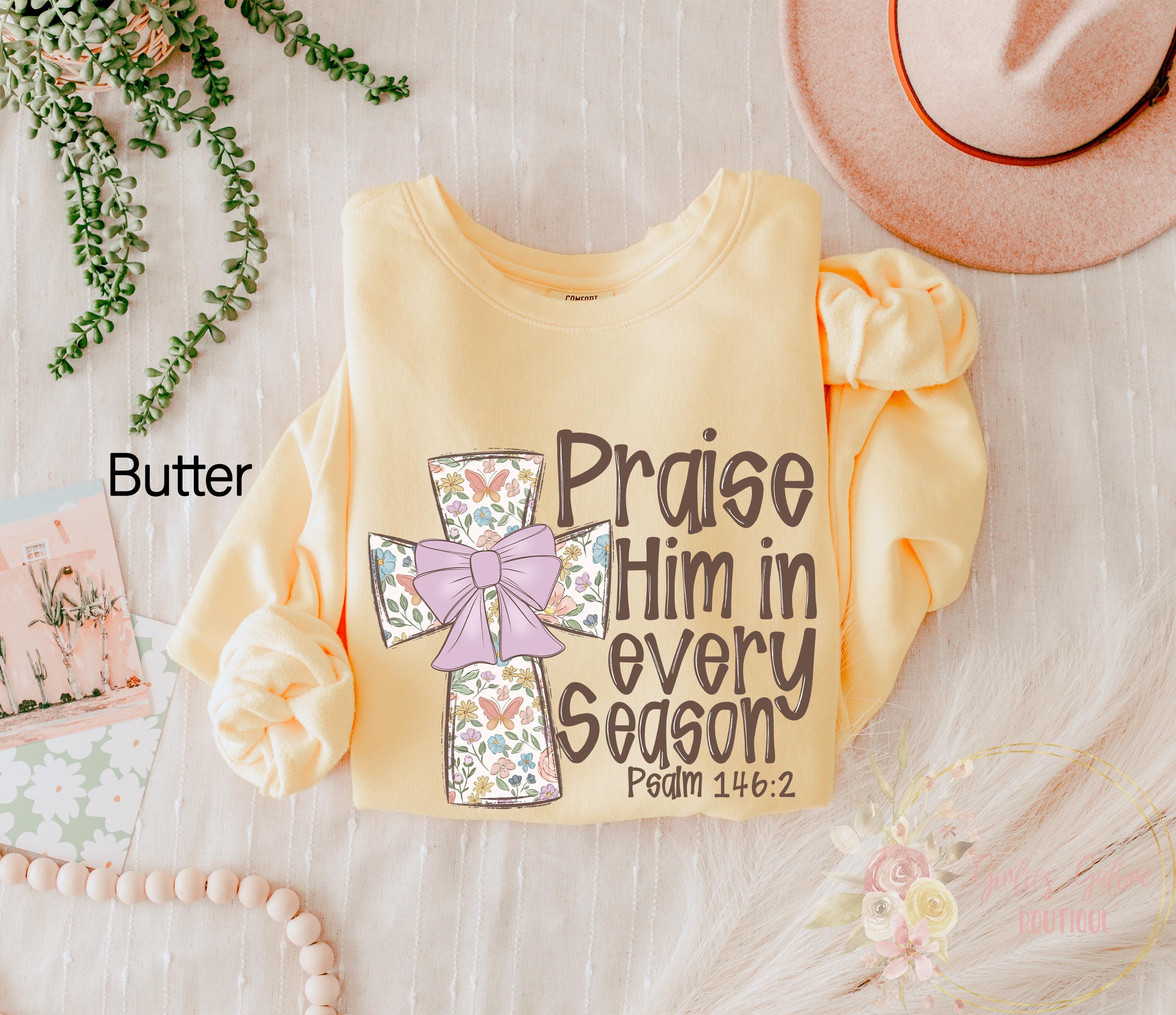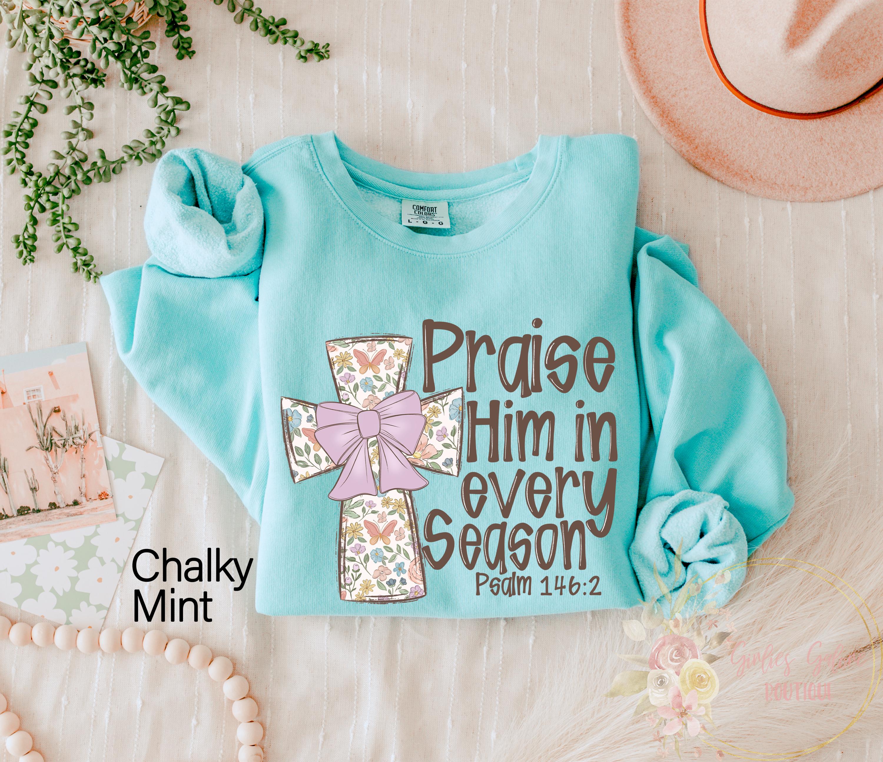 Comfort Colors® Praise Him In Every Season sweatshirt, Psalm 146:2 Bible Verse Shirt, Jesus Love, Christian Faith Gift, Religious Shirts