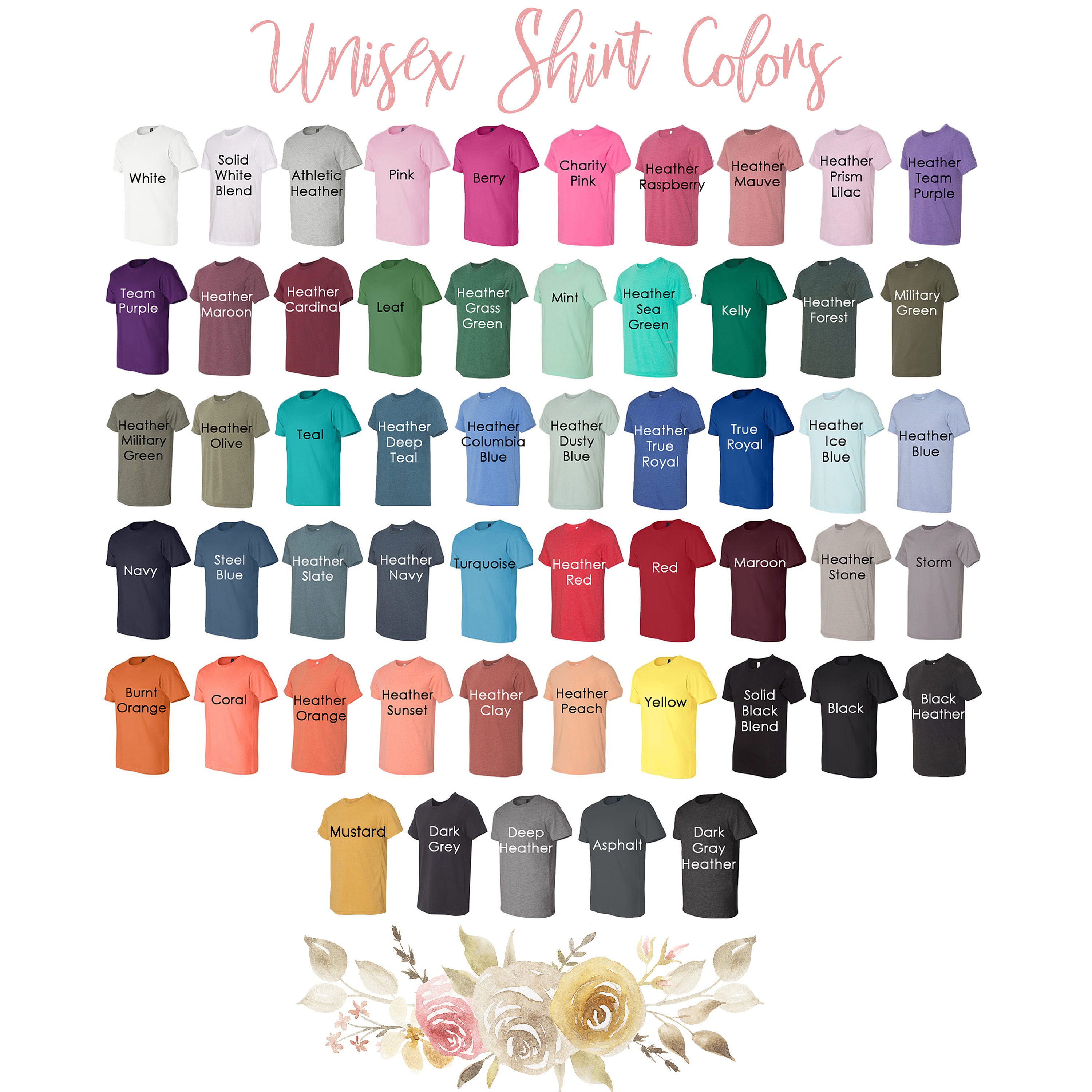 Want a different vinyl color? Not a problem! We love to customize our shirts just the way your want them! Use the vinyl color charts that are included in the listing photos and note your choice in the notes to seller section at checkout. (This is available only once you have started the checkout process.)